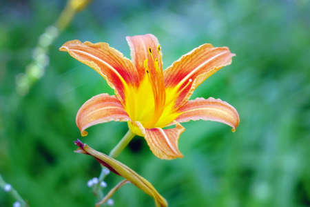 Popular daylily orange flower on natural green background. close-up in the garden