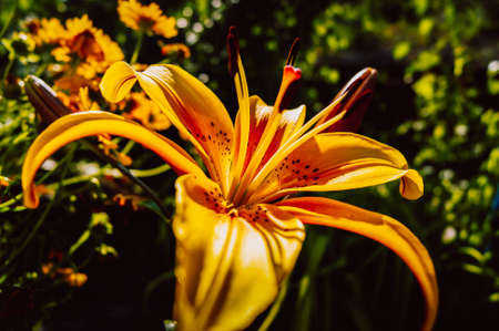 Beautiful and bright yellow lily. Sets the summer mood. A bright flower. Natural beauty.