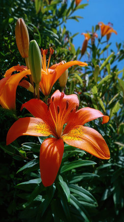 Close-up view of vibrant orange lilies amongst lush foliage. The image focuses on the intricate details of the flowers and the rich tones of the surrounding leaves and buds.