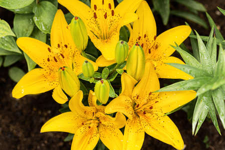 yellow lilies folwers named Fata Morgana grwoing in garden at sunlight.
