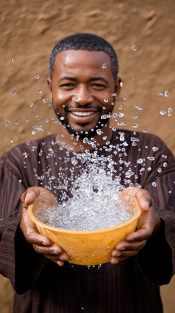 Man joyfully splashing water from a bowl outdoors, showcasing happiness and connection with nature in a warm, sunny environment