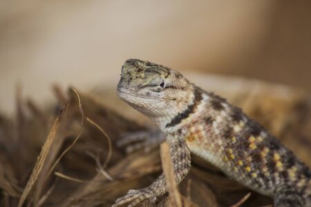 Yellow-spotted Agama, Trapelus flavimaculatus in desert in Jordan. Specie of agamid lizard of Middle East. Wild animals life. Close up