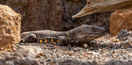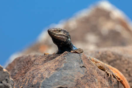 Close-up of Gran Canaria giant lizard, Gallotia stehlini. It is endemic to Gran Canaria, in the Canary Islands, Spain. Photo taken in Maspalomas