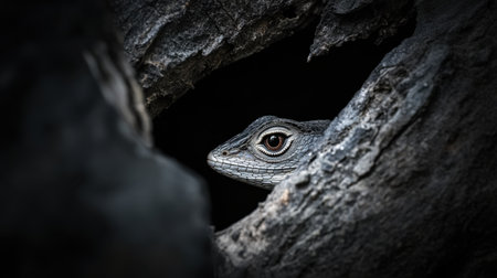 This mesmerizing image captures a lizard peering through a dark hollow in a tree, showcasing nature's intricate details and serene beauty.