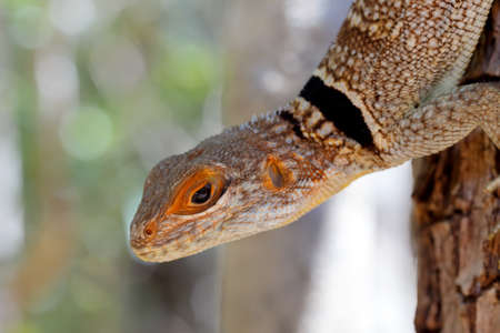 Chlamydosaurus kingii - brown lizard on a wood trunk.
