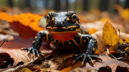 A Striped Newt (Notophthalmus perstriatus) crawling through the leaf litter in North America, its bright stripes and orange belly a vibrant image against the brown leaves.