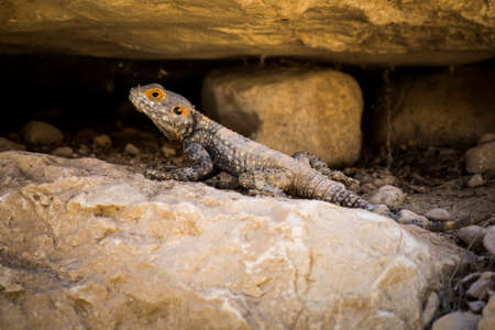 Ornate spiny tailed lizard, Uromastyx ornata, resting on a rock