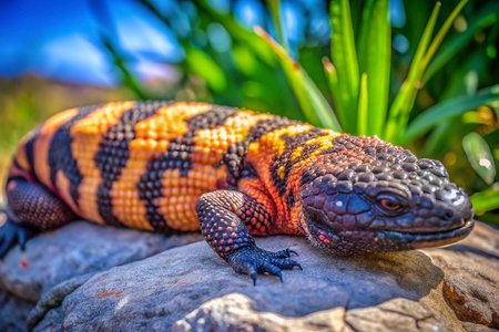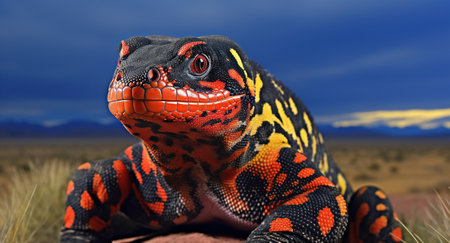 Gila Monster lies quietly showcasing its unique black and orange patterned scales in a soft lit environment emphasizing its detailed texture and colors.