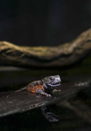 This close-up focuses shot on an orange and black lizard, showing its intricate scales and unique coloration. The lizard appears alert and is likely exploring its surroundings in a natural habitat.