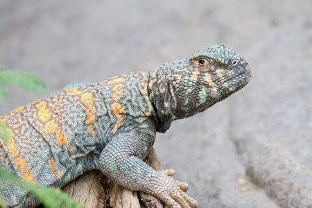 Close-up of lizard in its habitat on land. Beautiful reptile in zoo terrarium. Exotic tropical animals concept.