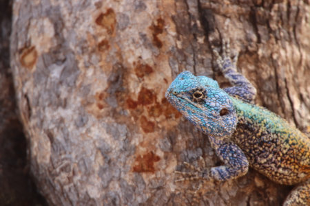 Close-up of a Male Southern rock agama (Agama atra) in the tree with its beautiful bright blue head in the Kruger National Park of South Africa.