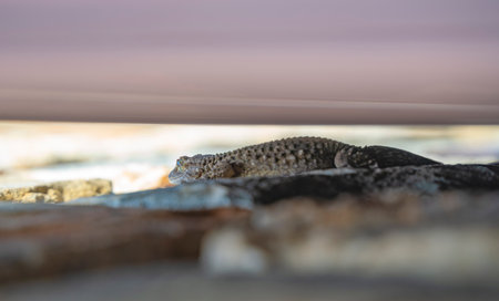 Low angle shot of a common wall gecko on stony ground lakes in Italy