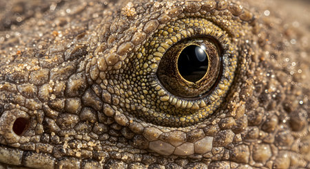 Intense macro closeup of a reptiles eye showcasing detailed scales and sandy texture on its skin