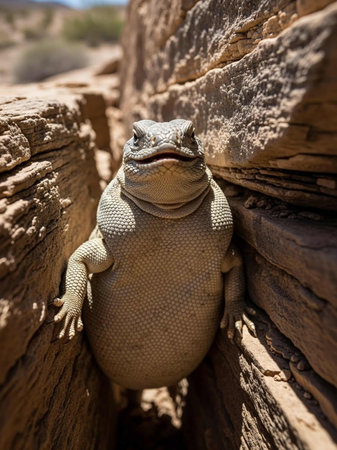 A large lizard is squeezed between two rocky outcroppings in a desert landscape