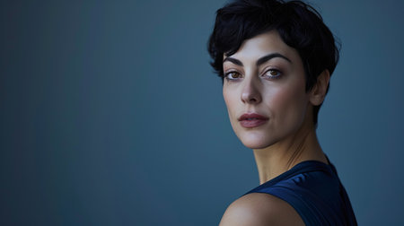 A woman stands confidently with her arms crossed. She has short hair and bright blue eyes. The background is gray, creating a simple look. The lighting is soft and even.