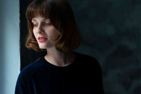 portrait of a young beautiful young girl age twenty-three years old, smiling, against a dark wall
