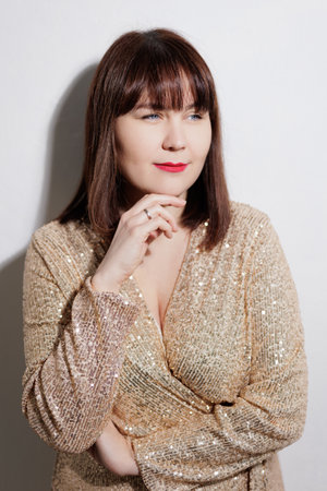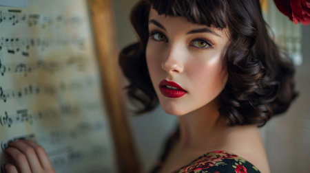 A woman with red lipstick and green eyes stands in front of a sheet of music. Concept of elegance and sophistication, as the woman's makeup