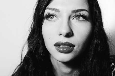 Black and white closeup of beautiful sexi young lady sensually looking up over light copy space background