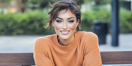 Young woman with stylish short hair smiles while sitting on a bench in a vibrant urban park. She wears a cozy orange sweater radiating warmth and confidence on a sunny day.