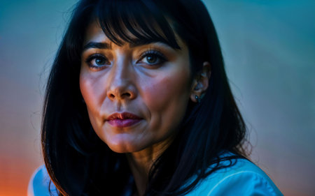 A woman with long, dark hair looks directly at the camera while wearing a yellow sweater. The soft blue background creates a calming atmosphere for the portrait.