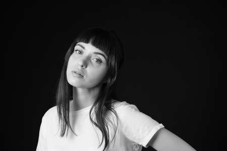 attractive woman on plein background shot in studio with soft lights with an interesting expression and dramatic lighting Black And White, b&w