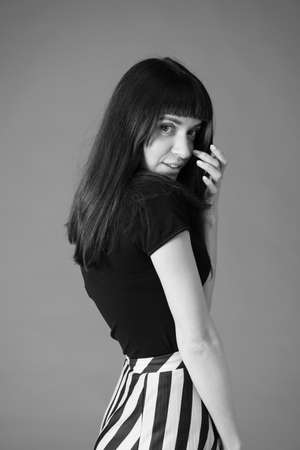 Studio portrait of a pretty brunette woman in a black t-shirt and striped skirt, standing halfturned, against a plain grey background, looking at the camera