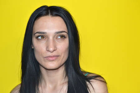 portrait of beautiful young pensive woman with long curly hair looking at camera