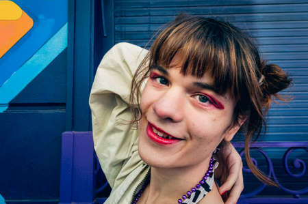 horizontal closeup portrait of happy transgender latin young woman with makeup looking at camera and smiling, posing standing in the street with blue wall in background, people concept with copy space