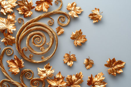 A golden wire in the shape of ivy leaves spirals upwards, with leaves scattered around it. The background is gray, and there is nothing else but the gold. It should look like an ancient Greek ornament, made by pouring hot metal into spiral shapes --chaos 30 --ar 3:2 --quality 2 --stylize 250 --v 6.1 Job ID: 55ef6c9e-cab4-4066-b9d2-a4890d16dafd