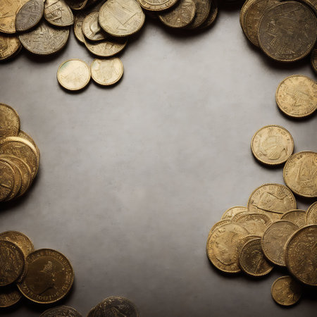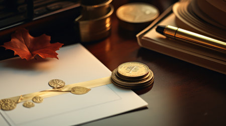 This stunning flat lay image features a luxurious arrangement of golden flowers and decorative coins on a rich dark background, ideal for celebration themes.