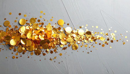 A visually appealing arrangement of scattered golden fragments on a smooth surface, perfect for use in luxury design projects or creative artwork.