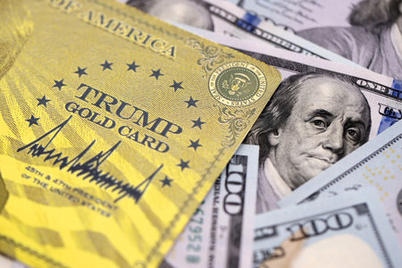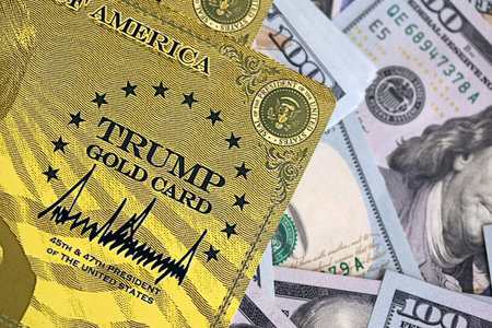 KYIV, UKRAINE - DECEMBER 13, 2025 Trump gold card souvenir on big amount of US hundred dollar bills banknotes