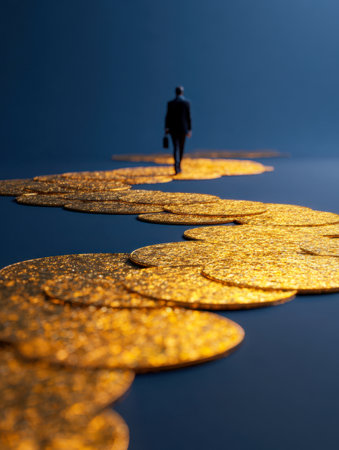 A confident executive strides along a luminous, golden currency trail against a sleek, futuristic skyline, embodying progress and prosperity in a digital age.