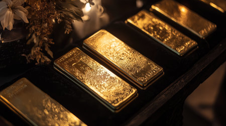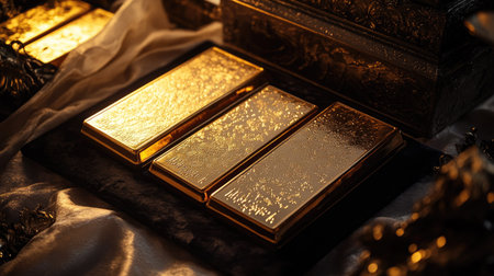 An elegant display of gold bars on a dark velvet surface, with soft lighting highlighting their shiny surfaces and intricate engravings.