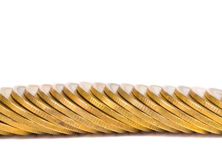 Columns of gold coins, piles of coins arranged on white background, business banking idea.