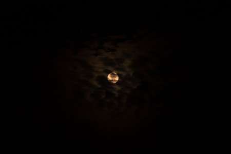 This stunning image captures a full moon radiating warm orange light against a deep dark background, creating a serene and tranquil night scene.
