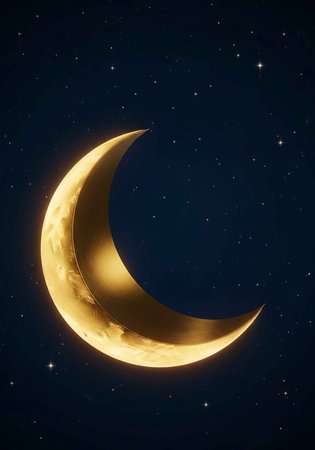 A vivid crescent moon glowing brightly against a dark, star-filled night sky.