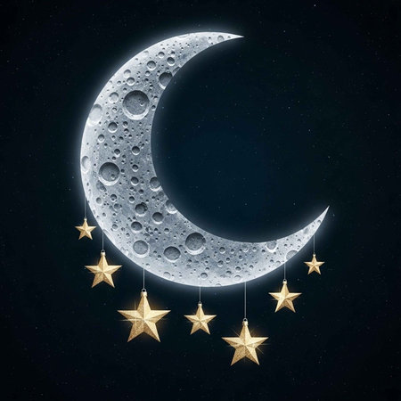 A detailed crescent moon with a textured surface and six golden stars hanging from its curve against a dark night sky.