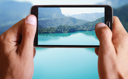 Male hand taking photo of a lake with green mountains landscape with cell, mobile phone.