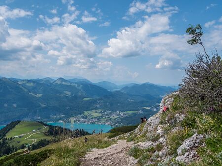 Panoramic view from Schafberg monutain to lake Attersee, Austrian Alps, next to Sankt Wolfgang im Salzkammergut