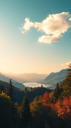 Autumn landscape with mountains, lake and forest. Colorful autumn trees in the mountains.