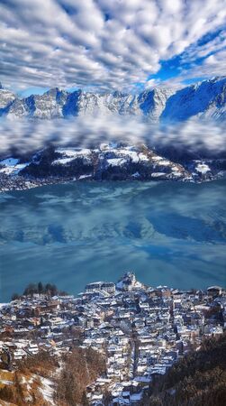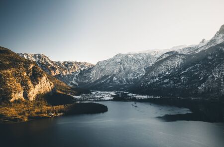 view of famous Hallstaetter Lake in the Austrian Alps, region of Salzkammergut, Austria in Winter