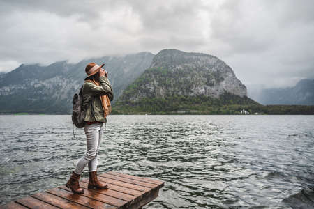 Young photographer at the alpine lake