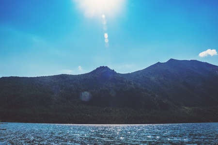 panoramic view of the lake and mountains in the rays of the sun