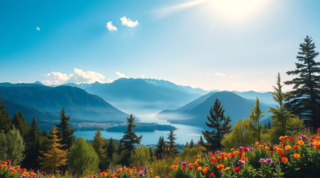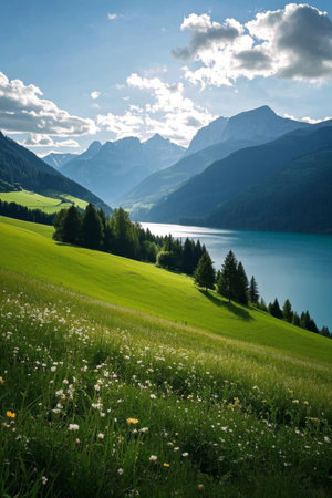 beautiful mountain landscape with lake and forest under blue sky, Switzerland