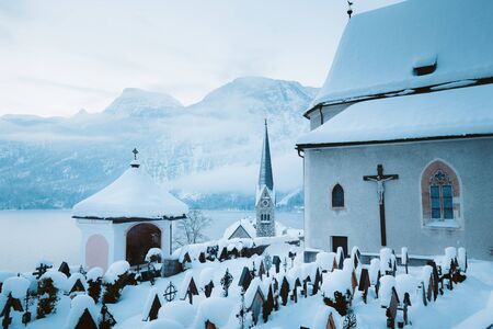 Famous Hallstatt lakeside town with church tower and graveyard on a beautiful cold morning in winter, Salzkammergut, Austria