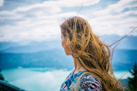 Woman in alp mountains looking at Walchensee