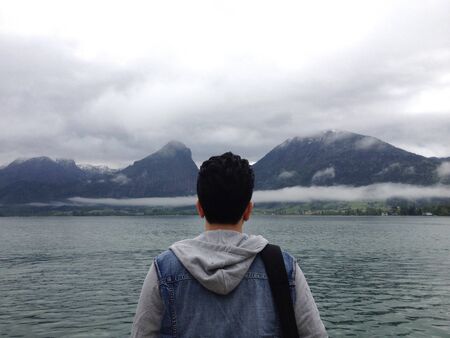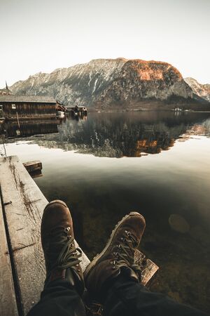 Person looking at mountain Lake Hallstatt in Austria. Boots view of a man sitting at the Pier in Winter