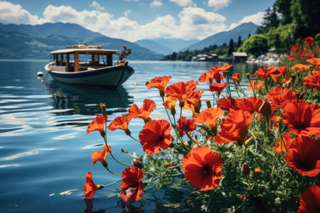 landscape with a beautiful mountain lake and boats in the foreground. autumn