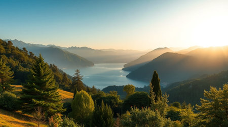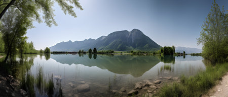Panoramic view of the lake and mountains in the morning.